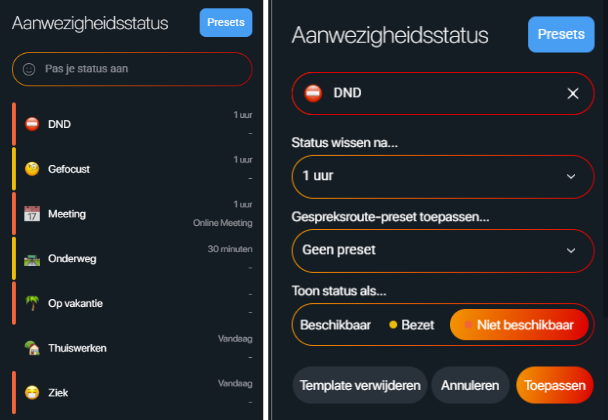 Handig zijn de Status Presets die je zelf kunt aanpassen en toevoegen. Hiermee automatiseer je wat er achter de schermen gebeurt zodra je een status kiest. In een preset stel je in: