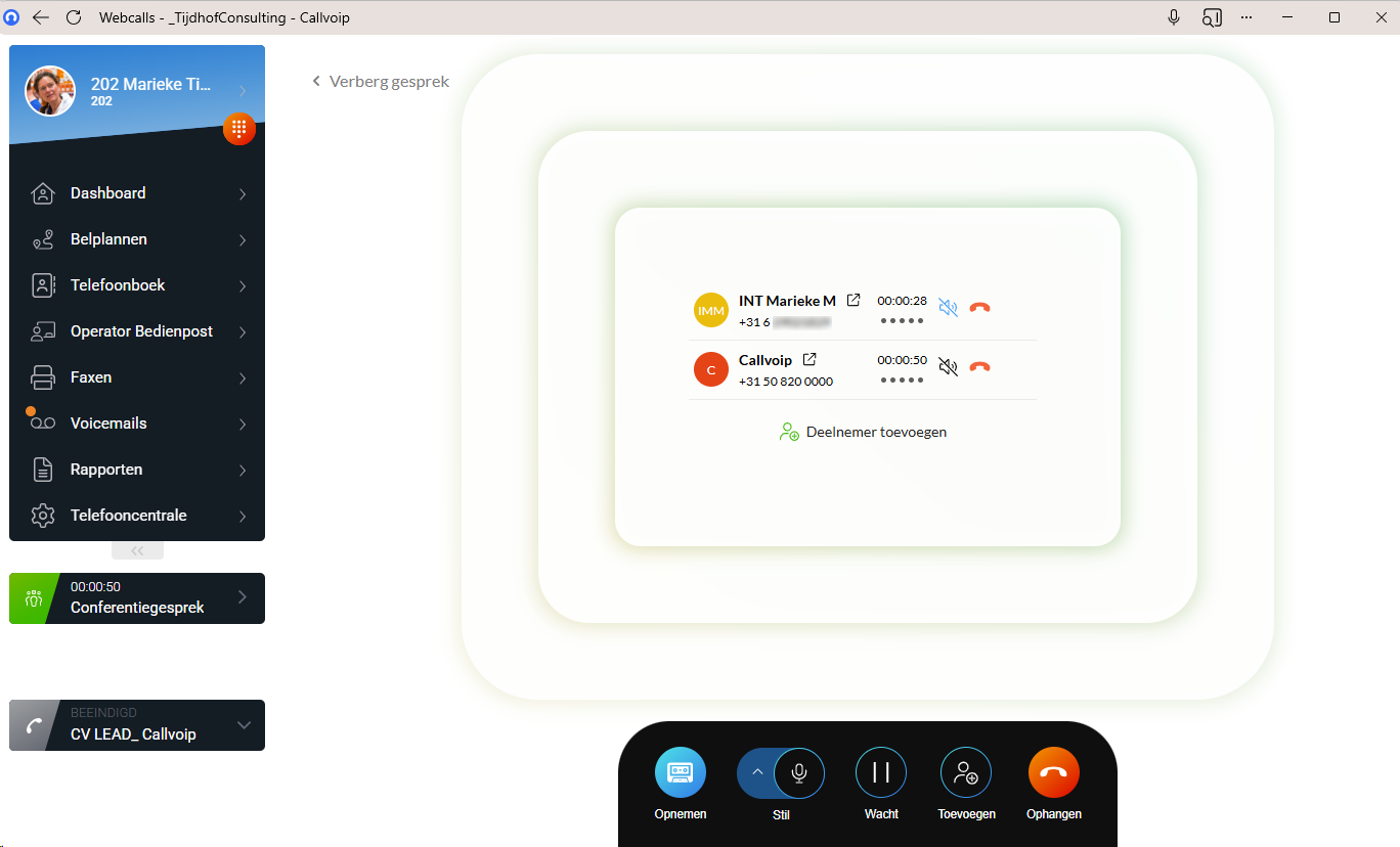 - Starten: Klik tijdens een actief gesprek op de knop ‘Conference’ in de actiebalk.